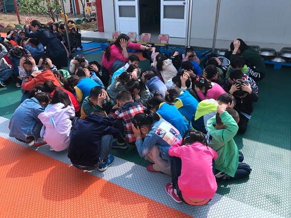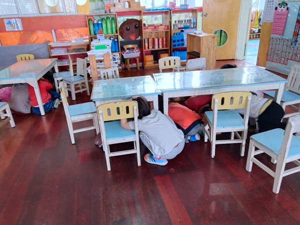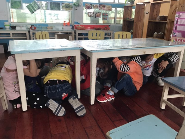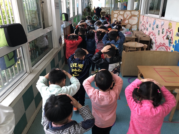 下午三点,小朋友们都在教室里,下午的点心时间刚刚结束,突然警报响起,老师们迅速带领幼儿抱头躲到桌子底下。广播里通知地震了,请小朋友立即疏散到安全地带。此时老师们便迅速疏导幼儿往教室外撤离,仅仅3分钟的时间全园师幼迅速有序地撤离到安全地带。防震防火演练幼儿园每年都会举行,目的为了增强师生安全意识,提高防范自救能力,遇到突发事件能有序迅速的按照熟悉的逃生路线安全疏散,以最大限度保护师生安全。家长们也应该引起重视,平时也应教导小朋友遇到突发事件,如何处理的一些小常识。