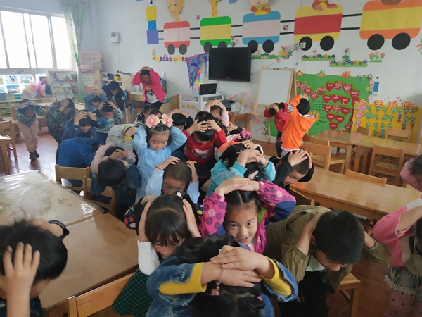 因为此次演练没有事先告知,来到操场集合后,老师们带领各班幼儿做了放松。各班级清点人数后汇报年纪组长,再有年纪组长汇报给支持本次防震演练的陆建芬副园长。待幼儿平静下来,陆建芬副园长对本次演练做了总结,并且对幼儿进行了防震知识以及疏散避震动作的讲解,提醒幼儿碰到地震时要不慌不乱,积极自救。