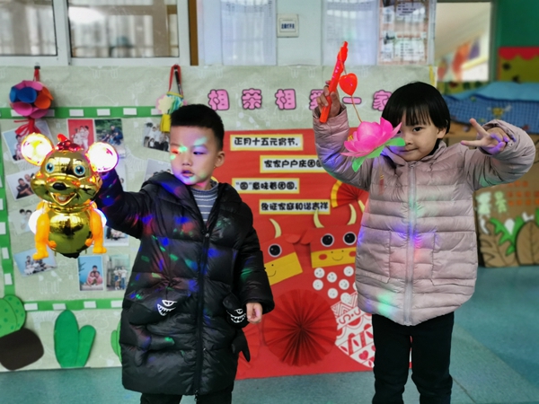 最后孩子们还在一起“赏”花灯,小朋友带来的花灯各式各样,有买的灯笼灯、小猪灯、荷花灯、小兔灯、牛牛灯……还有心灵手巧的家长自制的绕线灯、红包灯、彩片灯等等,真的是应有尽有呀!让人目不暇接!