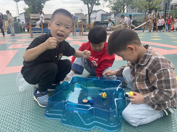 比赛场地设置在户外塑胶场地上,赛前我们和孩子们一起收集大小不一、各种各样的陀螺,在与材料的互动中,感知陀螺的各种特性。他们和小伙伴一起介绍自己带来的陀螺……“陀螺下面有个尖尖呢。”“中间一圈比较胖,圆圆的。”“我的陀螺像一个雨伞!”“我的陀螺可以发光。”孩子们说起陀螺来滔滔不绝……