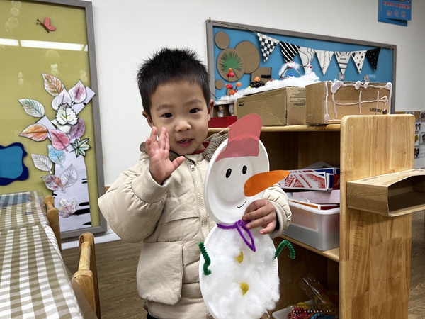 在孩子们精心的制作下,一个美丽的小雪人就完成了,老师对雪人进行细节上的完善,并将孩子们的作品挂在教室进行展示。