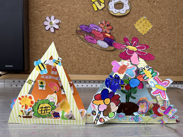 活动开始前,老师提前准备好制作好的三角花篮,任孩子们凭借想象力和创造力装饰花篮。我们一起来看一看孩子们是如何把春天装进花篮的吧!首先,每个小朋友都用彩笔绘出一朵朵精致可爱的花朵、一只只翩翩起舞的蝴蝶......随后用剪刀将小花、蝴蝶、蜜蜂等剪下,你帮我剪、我帮你贴。孩子们一边商讨如何将花篮设计的更漂亮,一边小手不停歇地积极创作,每个小组的成员都发挥着自己擅长的本领呢!经过一个小时的努力,每个小组都完成了花篮DIY作品,我们将这些作品进行了评比,大家看看是哪个作品更胜一筹呢?