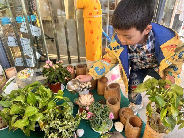 孩子们在照顾自然角中,了解了基本的劳动常识,收获了照顾、爱护植物的责任心。“你来浇水”、“我来剪叶片”、“他来擦架子”小朋友们在其中尝试分工、相互合作,这些美丽的花花草草与小朋友们在一同长大。在这一方小小的角落里,蕴藏着大大的自然。