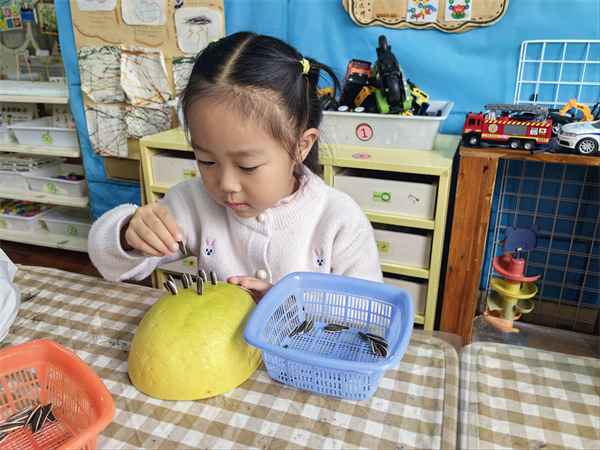 创作环节正式开始,孩子们在老师的指导下有序领取材料。第一步,大家先感受柚子的形状和质感,将柚子蒂作为小刺猬的头部,圆润的柚子身体恰好契合刺猬的外形。接着,孩子们小心翼翼地用胶水将葵花籽一颗颗粘贴在柚子表面,模拟小刺猬背上的尖刺。有的孩子顺着柚子弧度整齐排列,有的则随意点缀,让“刺”变得错落有致。